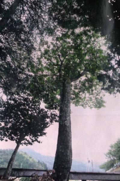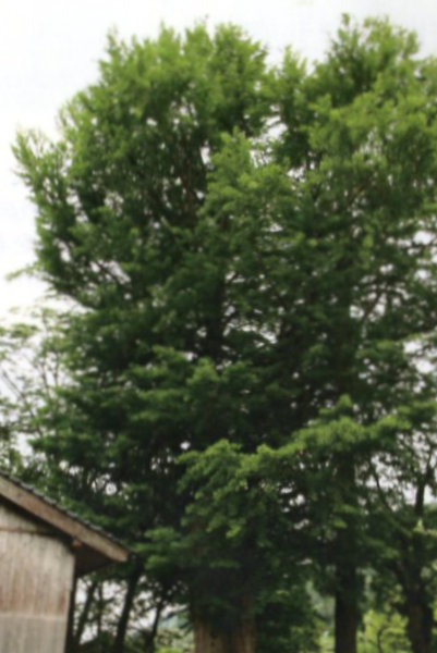 | 1-3 宮垣天満神社のフジキ 当神社の境内には、大イチョウやコウヨウザンなどが周囲を囲むように生育している。このフジキはその内の1本で、コウヨウザンの左側に分枝しながらそびえている。