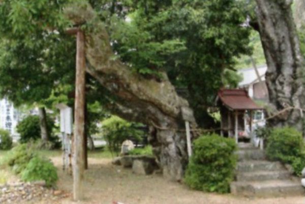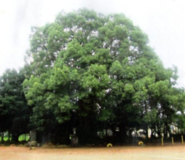 | 14 池田大神宮のカゴノキ 通称かごの木・むくの木。現存する樹は雌木で、巨木の大部分が枯損し、一部分が残って生存している。根元近くから二本に分かれて国道側に伸びている。樹高はカゴノキにしては低く、ずんぐりとした樹形である。