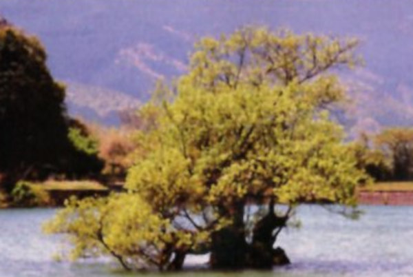 | 13 多保市大池のマルバヤナギ 多保市公会堂や善光寺のそばにある大池のほぼ中央近くに生えている。根元が島状になっており、池の水が多いときには、まるで湖面に浮かんでいるように見える。書画に堪能であった福知山藩六代藩主朽木綱貞(1713〜1788)がこのマルバヤナギを描いており、江戸中期には既に現在の姿であったと推測できる。