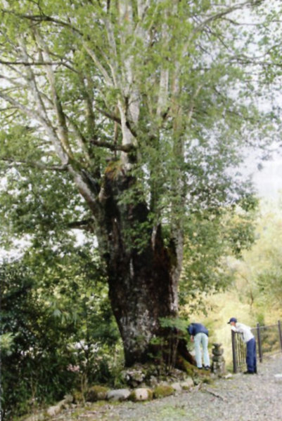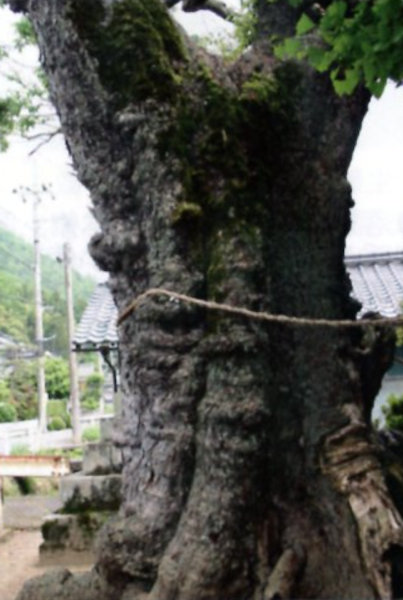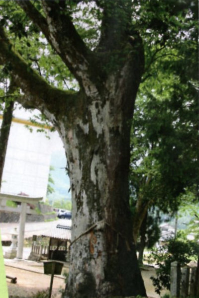 | 14-2 池田大神宮のムクノキ 池田大神宮のカゴノキに相寄ってそびえ立つ巨木で、相当な樹齢を重ねている。近世の山陰道(京街道)、現在の国道9号線のそばに位置していることから、幾人の目に留まったことだろうか。老樹故に大きな空洞があり、樹皮で生きている。過去に土壌改良、枯損部の切除などによる樹勢回復を図った。現在の境内は狭く、ムクノキやカゴノキの巨樹が生存していくには、好適な環境とはいえない状態である。