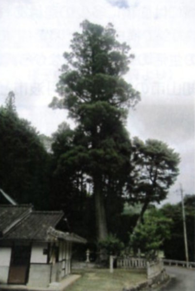 | 1-2 宮垣天満神社のコウヨウザン 社前の右にイチョウの大木と通路をはさんで左に高くそびえているので、遠くからでもよく目立つ。これだけ太いものが残っているのは珍しい。当地では、コウヨウザンの葉がクジャクの羽のようであることからクジャクスギと呼んでいる。