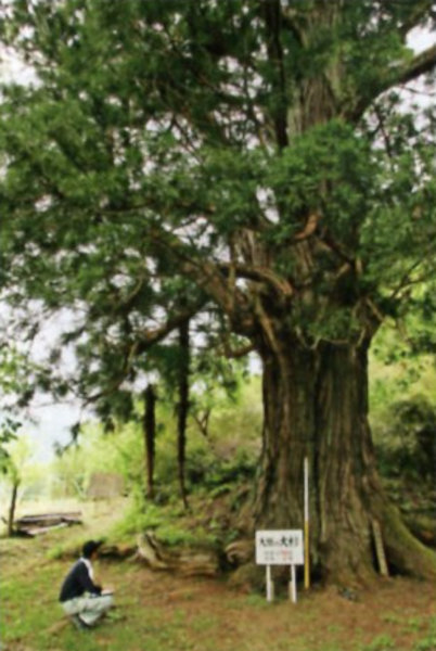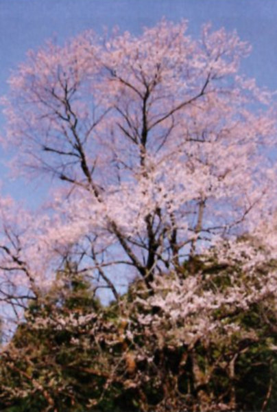 | 2 高内のエドヒガン 写真は夜久野学園の西にある墓地横にそびえる2本のうちの1本。春には国道9号線からその見事な桜に目を奪われる人も少なくない。地上高30cmで主幹が4又にわかれている。府内でも屈指のエドヒガンと思われる。