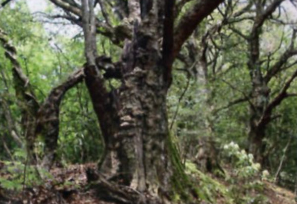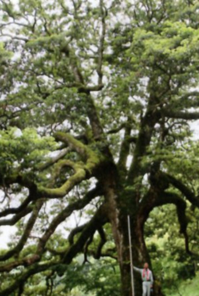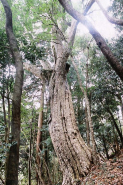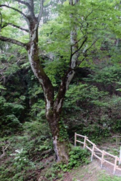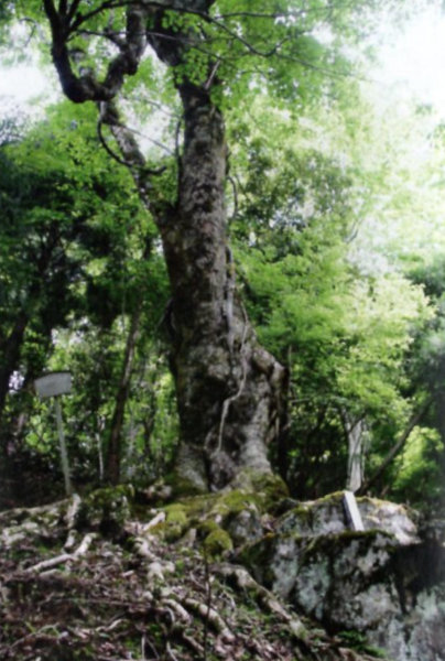 | 21 三岳山のウラゲトチノキ 本樹は葉の裏に細軟毛を生ずるのでウラゲトチノキの名がある。上佐々木の御嶽神社の表登山道の6合目あたりに生育する。根元には大きな塊岩があり、それに接して二又に分かれたひときわ目立つ巨木が立つ。本樹からは、かつて修験道の聖地であった三岳山にふさわしい霊気が感じられる。