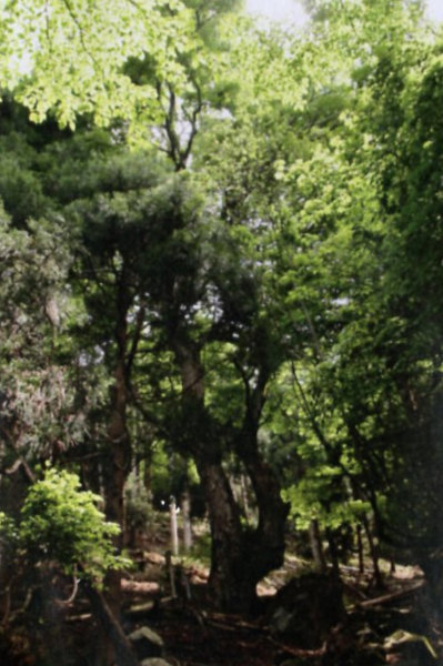 | 27 毛原大岩神社のアカガシ群 毛原の棚田のある毛原の大岩神社の境内の山林に群生するアカガシ群。丘陵斜面に群生する様は圧巻で、大小30本以上の分布が見られる中、胸高周囲が3mを超える巨樹と言える個体が9本ある。まぎれもなく府内でも希少な群生地である。