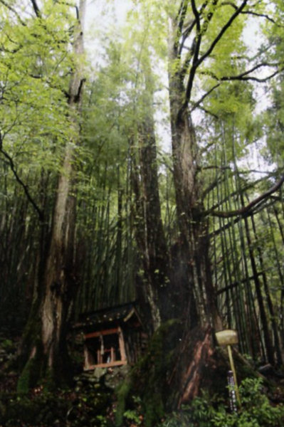 | 24 天座有徳神社のカツラ 社殿右裏山に生えている。大木が3本生えているように見えるが腐朽した主根のまわりから3 本に分かれ生長したものと思われる。中心に祠が祀られている。天座周辺には、源頼光の鬼退治伝説が多く伝えられており、この大木もこの伝説を見てきたのかもしれない。