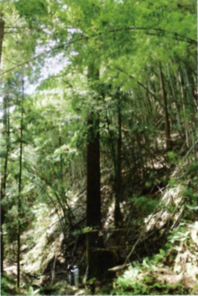 | 28 二俣不動のスギ 市民からの情報提供により現地で確認した。旧宮津街道の西側にそびえる大スギで、府内では最大級の樹高ではないかと思われる。市内最高樹高。
