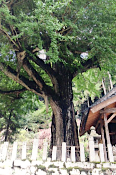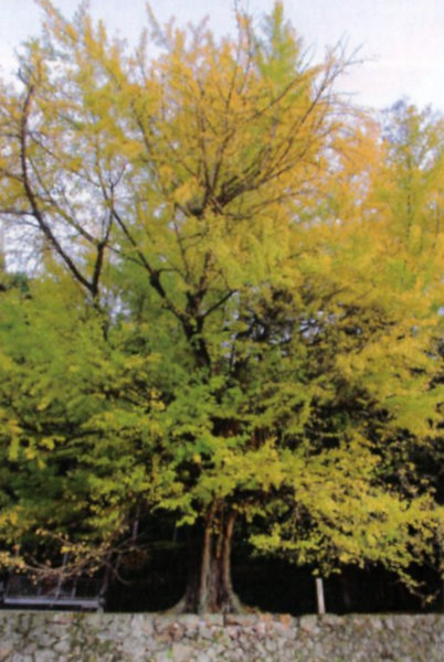 | 5 桑村大歳神社のイチョウ 夜久野町の北東部、畑谷の桑村の鎮守に立つ。夜久野町域の最も太いと考えられる大銀杏で、南に太い枝が数本出て気根が下がっている。雌木で種子は10月中旬ごろ成熟し、境内一面に落下する。晩秋には美しく黄葉する。