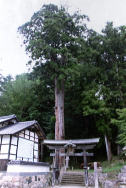 | 25-2 鬼嶽稲荷神社のサワグルミ かつて大江山(千丈ヶ嶽)へは、二俣から内宮を経て深山幽谷の北原へ入り、険しい山道を登っていた。現在では佛性寺から登山口の鬼嶽稲荷神社まで広い道が整備されている。鬼獄稲荷に近いその道路沿いに生育する、近隣では見られない巨木である。