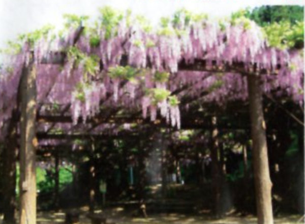 | 31 才の神のフジ 目通り周り7.9mの欅の巨木にからまり、四方にのびた大小6株が生育している。樫の木の根元に才の神の祠がある。立派な藤棚一面に藤の花が咲くのは見事である。 地元、南有路では開花に合わせて藤祭りを盛大に催し、多くの人で賑わう。一見の価値がある。一般に蔓の右巻のものがノダフジで左巻のものがヤマフジ。