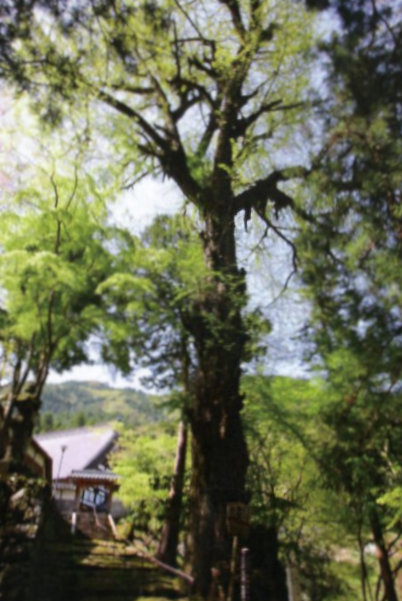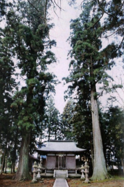 | 9 口榎原大歳神社のスギ 大歳神社社殿を挟み込むように二本向かい合って生えるスギの大木。大歳神社の参道の入口に立ち、本殿を正面に望むと、その両脇に、ともに真直ぐにそそり立つこの一対の巨木を見上げることができる。