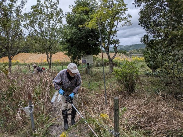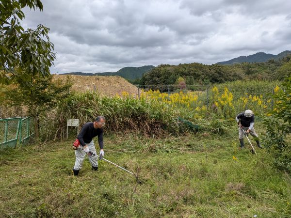 | 福知山市自然科学協力員の山段眞彦さん、小滝篤夫さん、京極春樹さん、塩見健男さん、塩見文雄さん、大槻浩さんは、2025年10月18日、三段池ビオトープの草刈りを実施しました。